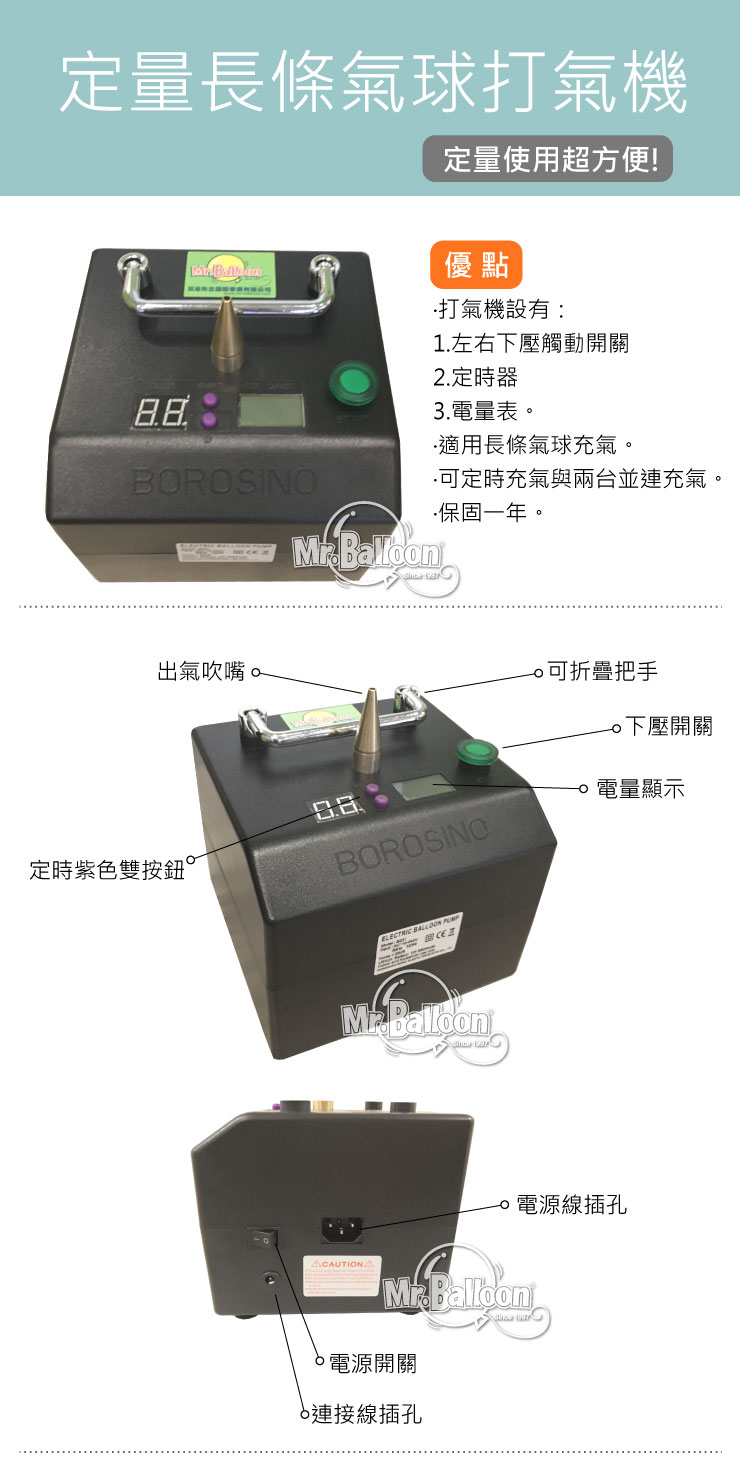 電壓:110V/12v ‧適用長條氣球充氣。 ‧設有1.左右下壓觸動開關2.定時器3.電量表。 ‧可定時充氣與兩台並連充氣。 ‧保固一年。
